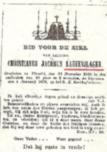 Christianus Jacobus Lautenslager, geb. op 3 sep 1820 (zo) te Utrecht [UT], Schoenmaker later Orgeldraaier in Utrecht, ovl. (45 jaar oud) op 31 dec 1865 (zo) te Utrecht [UT], Één document in dossier aanwezig. |
